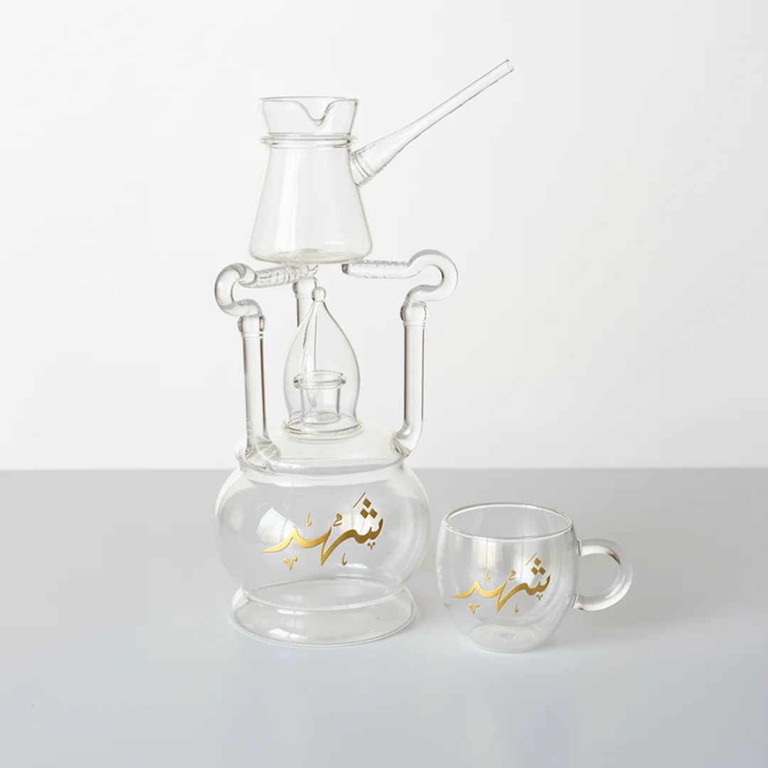 an exquisitely crafted luxury coffee set that transforms every brew into a ceremony. The centrepiece is a hand-blown glass Sebertaya engraved with a custom name of your choice, housed in a premium wooden box with everything you need for the perfect Oriental coffee ritual.