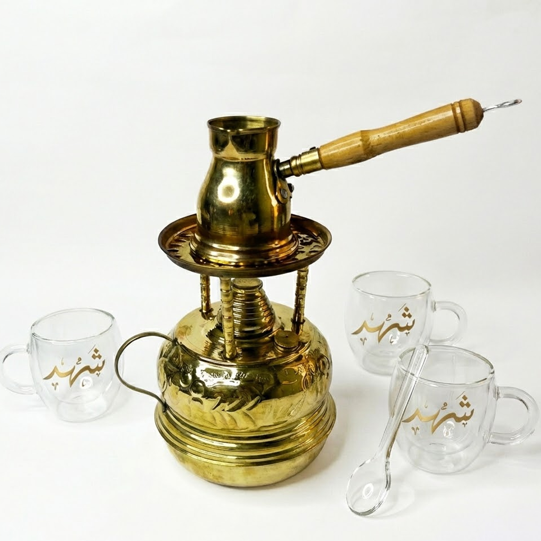Rule your coffee ritual with the Zahran Sultan Box. This magnificent copper Sebertaya set is a tribute to the golden age of Oriental hospitality rich, warm, and deeply regal.